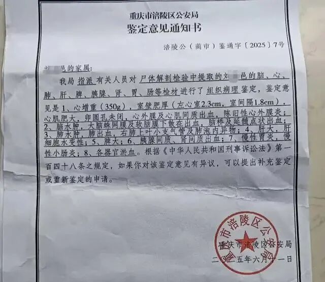 在收到基因测序检验报告后,涪陵区公安局出具了尸检鉴定文书,并将《鉴定意见通知书》当面送达刘某邑父亲及母亲陈某夫妇签字确认。家属对尸检结果有异议,遂联系了第三方鉴定中心开展二次尸检。